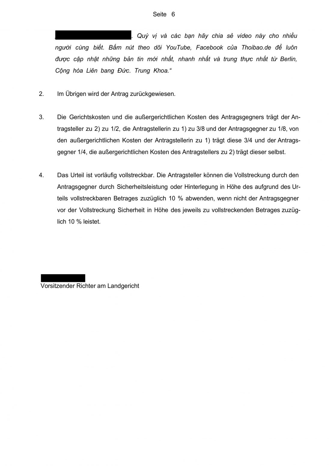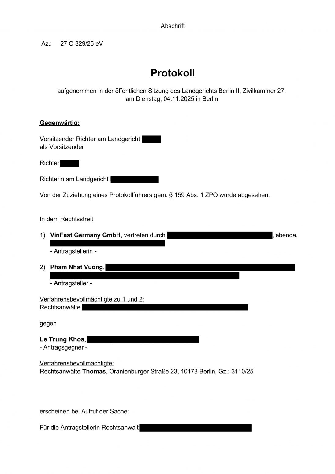 Biên bản quyết định của Tòa án Berlin hôm 04.11.2025 về vụ Phạm Nhật Vượng và VinFast Germany GmbH kiện nhà báo Lê Trung Khoa.